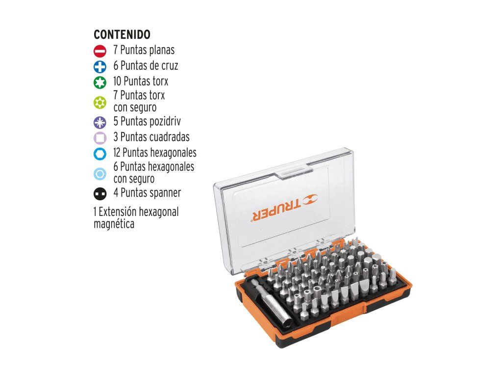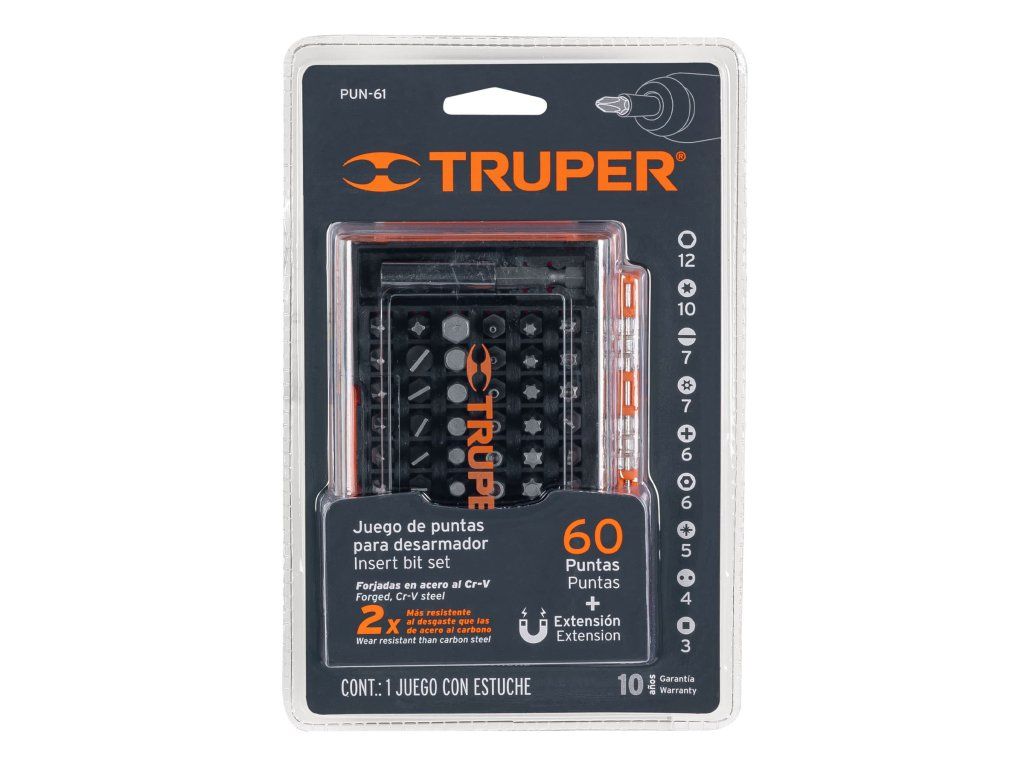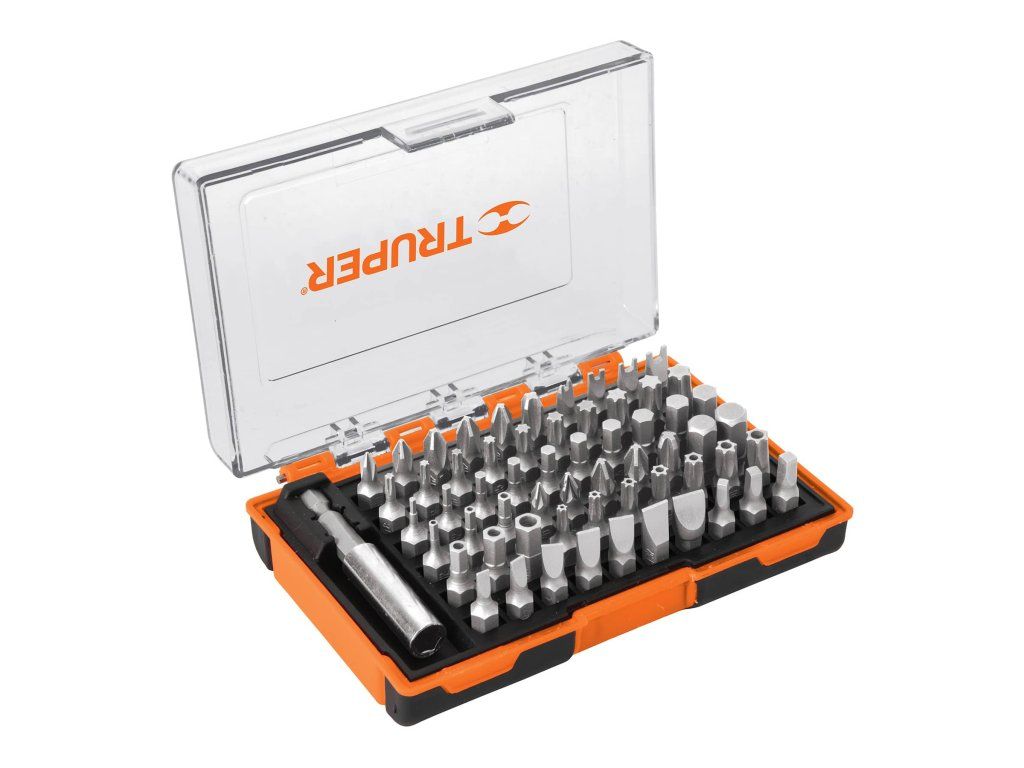 TRUPER – Sada bitů PUN-61: 61 ks, Cr-V ocel, 25 mm, s magnetickým držákem: Praktická sada bitů z chrom-vanadiové oceli s nejpoužívanějšími typy a magnetickým nástavcem pro přesnou práci.