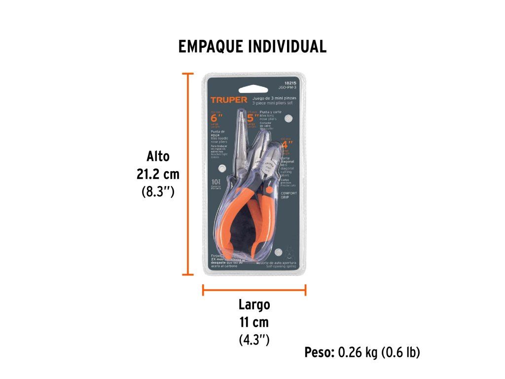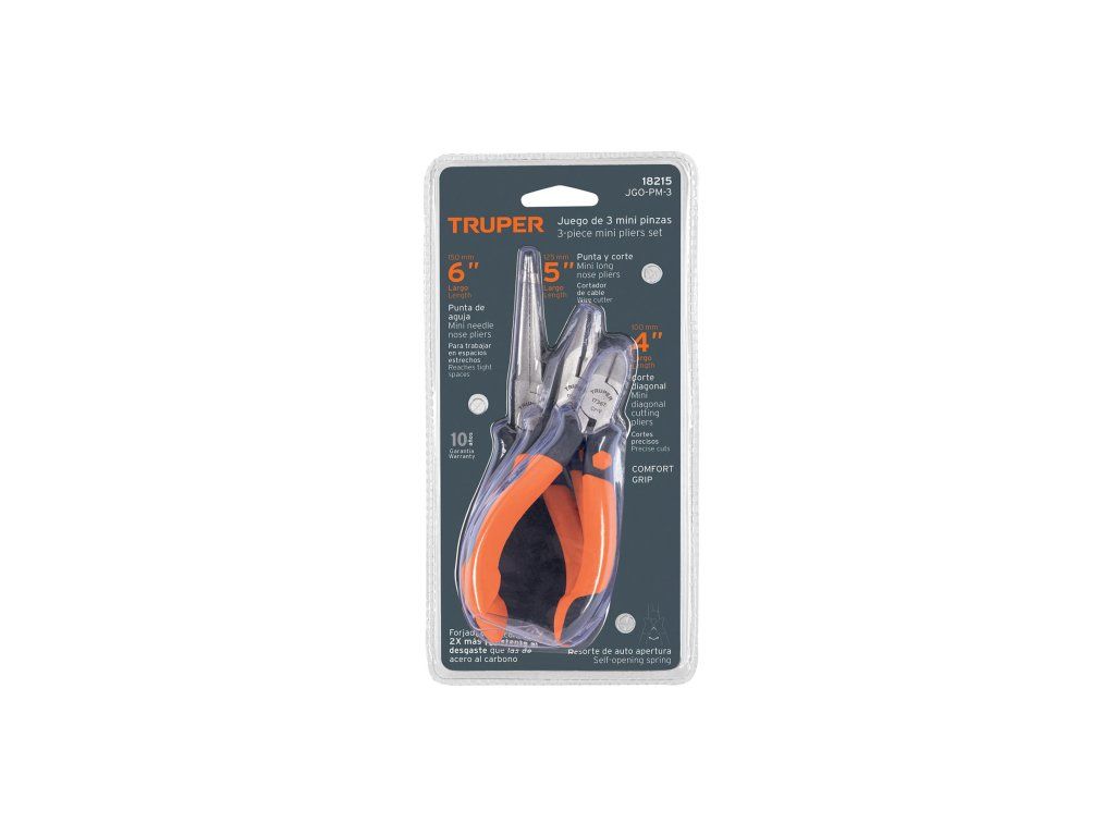 TRUPER – Sada mini kleští JGO-PM-3: 3dílná sada mini kleští z CrV oceli s pružinou pro snadné ovládání, ergonomickou rukojetí Comfort Grip, vhodná pro přesnou práci, stříhání i manipulaci v těžko přístupných místech.