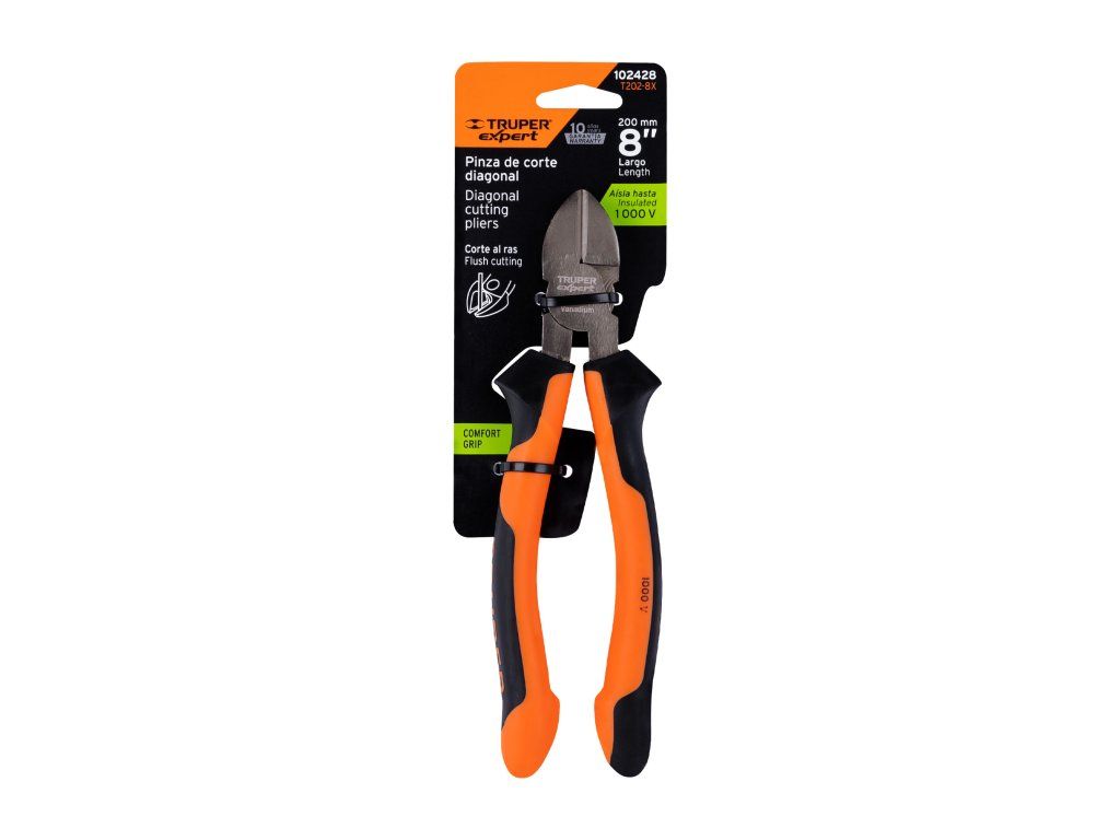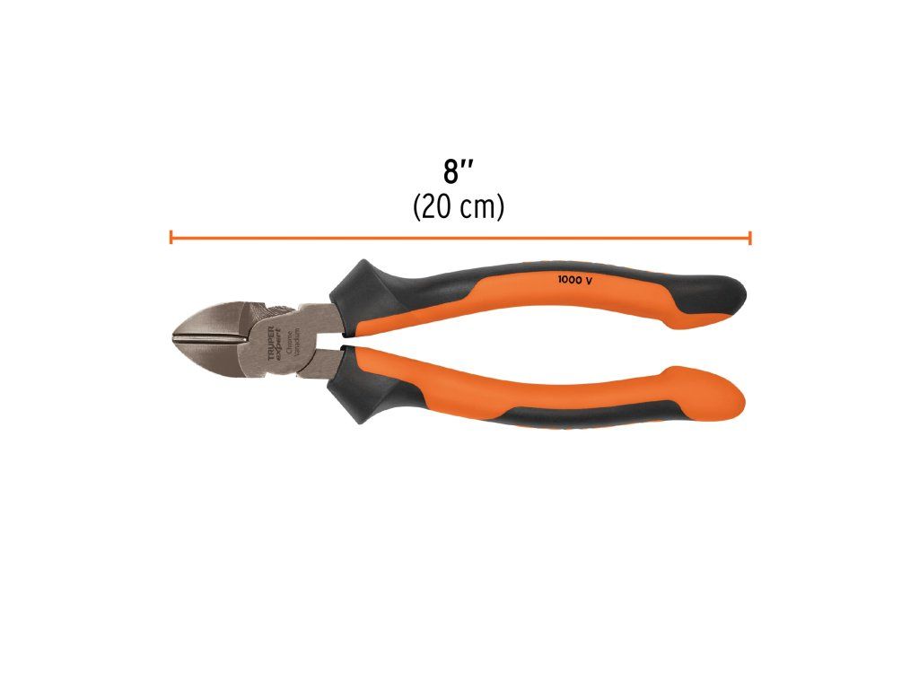 Elektrikářské štípací kleště TRUPER Expert T202-8X: profesionální boční štípací kleště z chrom-vanadiové oceli s izolací do 1000 V a ergonomickou rukojetí Comfort Grip pro přesné stříhání vodičů.