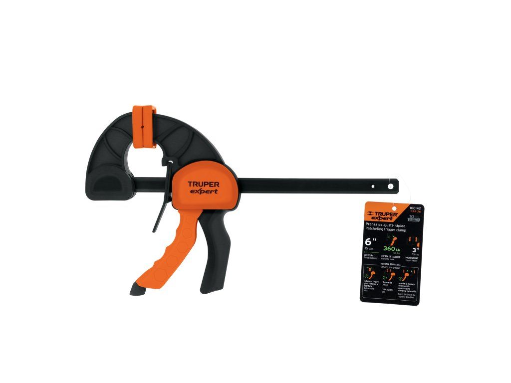 TRUPER Expert – Rychloupínací truhlářská svěrka PAR-26: profesionální svěrka s ocelovou lištou, nylonovým tělem, rychloupínacím mechanismem a reverzními čelistmi pro upínání i rozpěr.