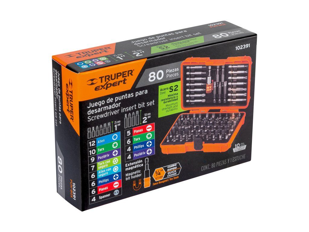 Sada bitů TRUPER Expert PUN-80X nabízí široký výběr bitů různých typů a délek, což ji předurčuje pro profesionální i hobby použití. Díky kombinaci krátkých a delších bitů je vhodná pro různé pracovní situace.