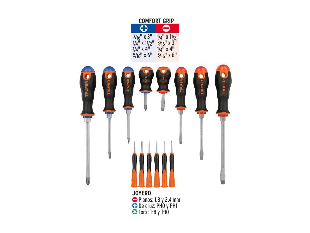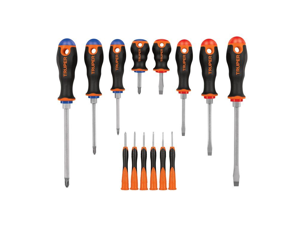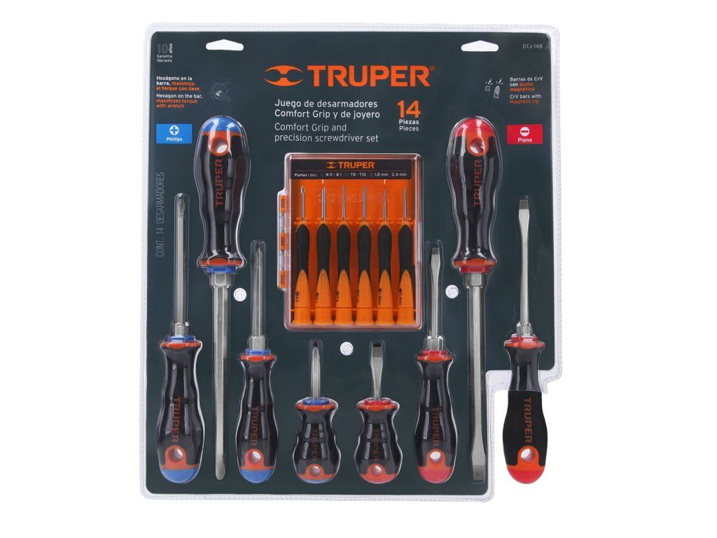 Sada šroubováků TRUPER DTJ-14B obsahuje 14 kusů šroubováků – 8 šroubováků s ergonomickou rukojetí Comfort Grip a 6 přesných hodinářských šroubováků pro jemné práce. Tyče jsou vyrobeny z chrom-vanadiové oceli, která je až 2× odolnější proti opotřebení než uhlíková ocel. Magnetická špička usnadňuje manipulaci se šrouby. Šestihranná část tyče umožňuje použití klíče pro zvýšení krouticího momentu. Barevné označení a popis na rukojeti umožňují rychlou identifikaci typu a velikosti šroubováku.