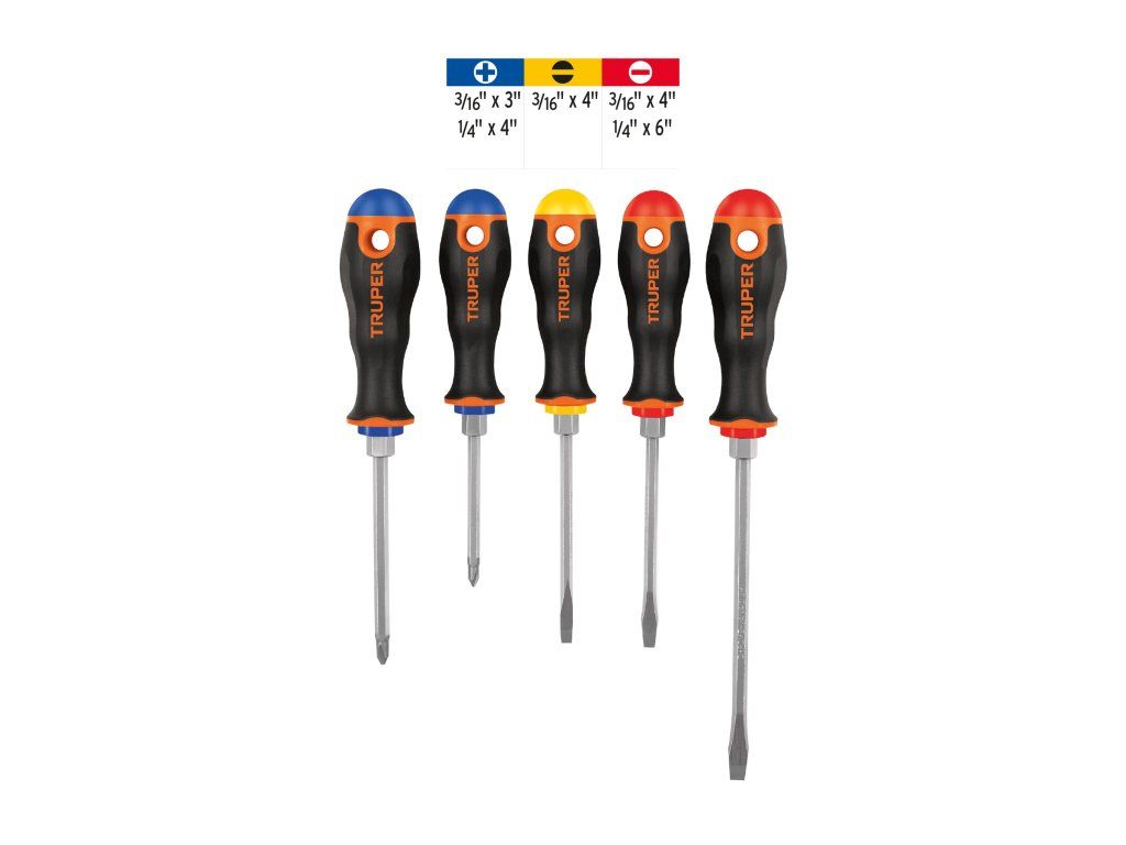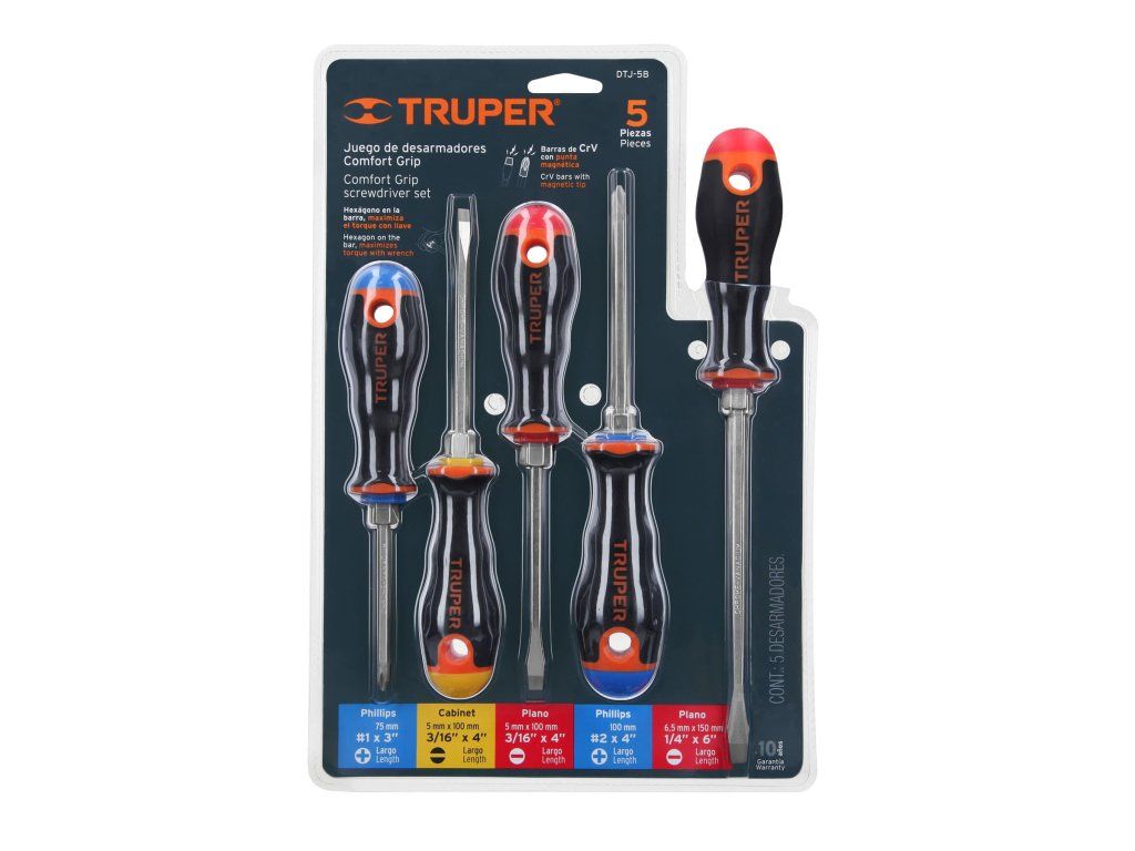 Sada šroubováků TRUPER DTJ-5B obsahuje 5 šroubováků s ergonomickou rukojetí Comfort Grip pro pohodlné a bezpečné uchopení. Tyč je vyrobena z chrom-vanadiové oceli, která je až 2× odolnější proti opotřebení než uhlíková ocel. Magnetická špička usnadňuje manipulaci se šrouby. Šestihranná část tyče umožňuje použití klíče pro zvýšení krouticího momentu. Šroubováky mají barevné označení a popis pro snadnou identifikaci typu a velikosti.