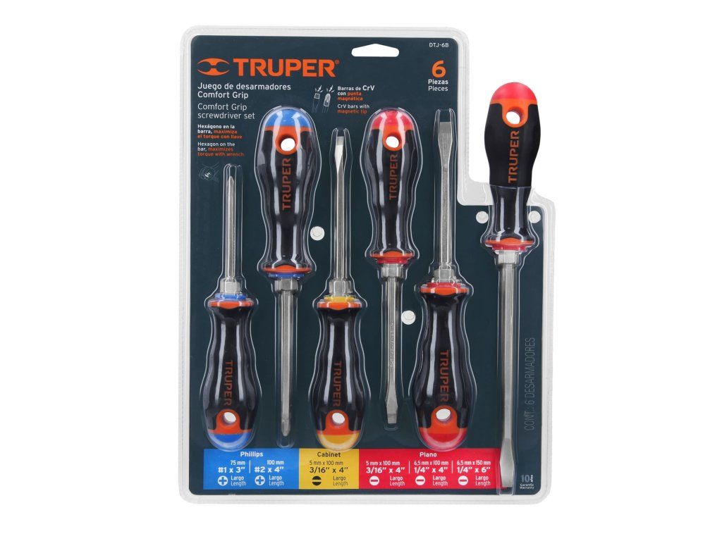 Sada šroubováků TRUPER DTJ-6B obsahuje 6 šroubováků s ergonomickou rukojetí Comfort Grip pro pohodlné a bezpečné uchopení. Tyč je vyrobena z chrom-vanadiové oceli, která je až 2× odolnější proti opotřebení než uhlíková ocel. Magnetická špička usnadňuje manipulaci se šrouby. Šestihranná část tyče umožňuje použití klíče pro zvýšení krouticího momentu. Šroubováky mají barevné označení a popis pro snadnou identifikaci typu a velikosti.