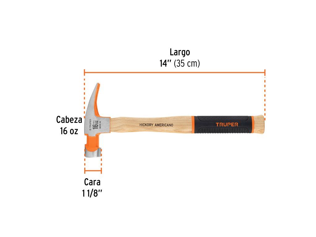 Tesařské kladivo TRUPER MOR-16: profesionální kladivo s leštěnou ocelovou hlavou, rovným drápem pro vytahování hřebíků a dřevěnou rukojetí Hickory s protiskluzovým úchopem.