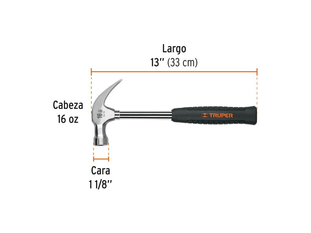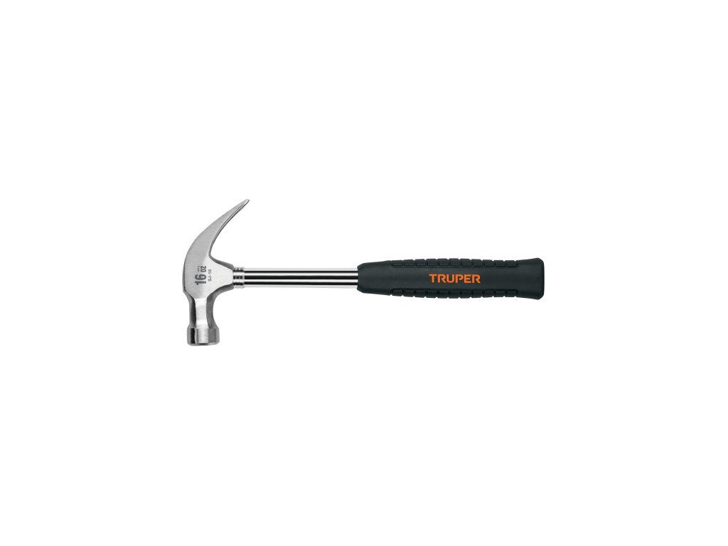 Tesařské kladivo TRUPER SJ-16: profesionální kladivo s ocelovou hlavou, zahnutým drápem pro vytahování hřebíků, magnetickým držákem hřebíků a tubulární rukojetí s TPR úchopem tlumícím vibrace.