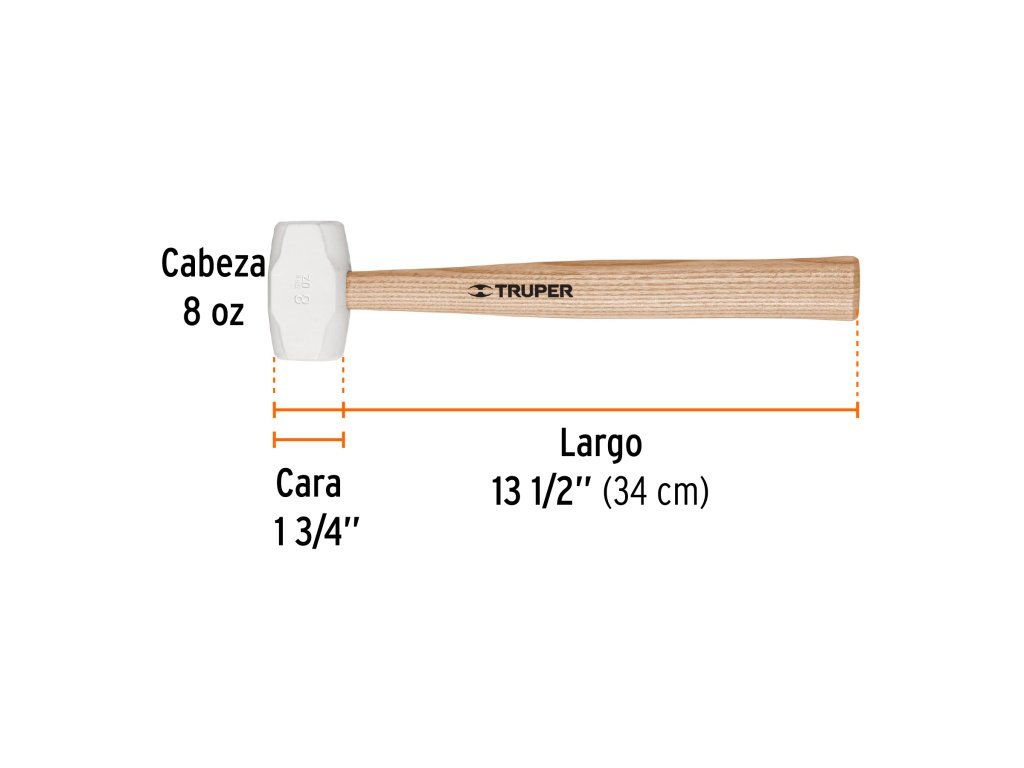 Gumové kladivo TRUPER MH-8: kladivo s bílou gumovou hlavou 227 g ze 100 % gumy a dřevěnou rukojetí 34 cm určené pro údery bez poškození nebo znečištění povrchu.