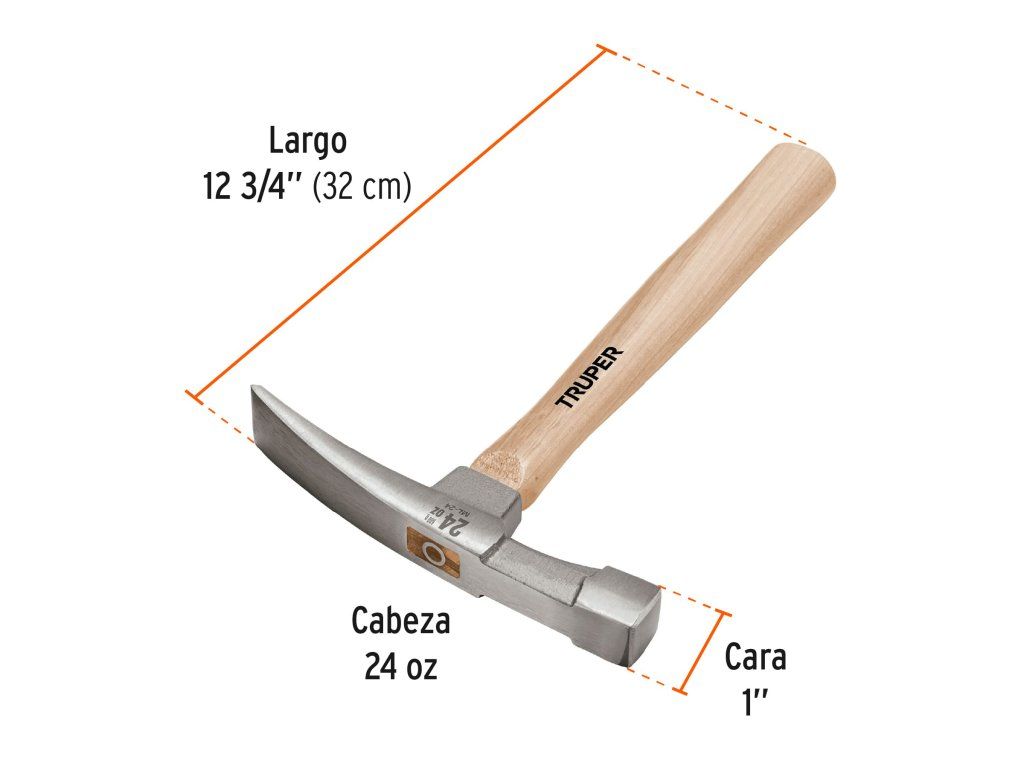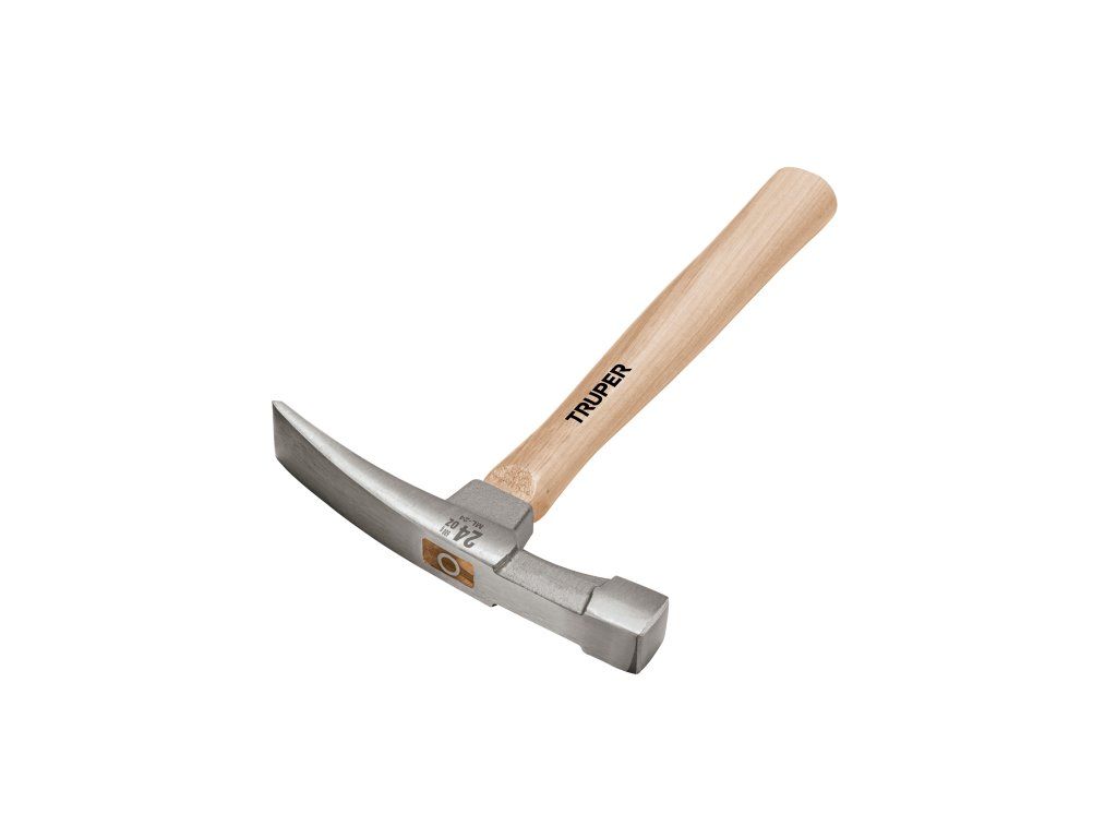 Zednické kladivo TRUPER ML-24: profesionální zednické kladivo s ocelovou hlavou 680 g, plochou úderovou stranou a sekací stranou pro opracování cihel, s dřevěnou rukojetí 32 cm.