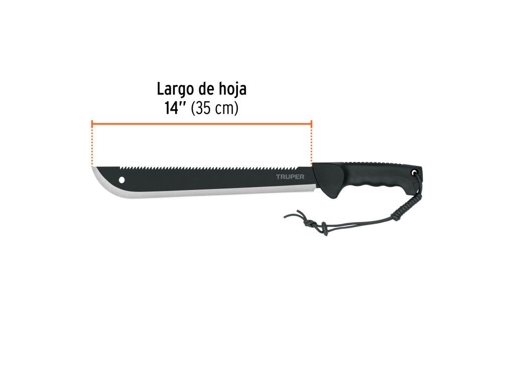 Mačeta TRUPER MACH-14X je určena pro sekání a řezání. Čepel o délce 35 cm je vyrobena z oceli 3Cr13 a má elektrostatický nástřik pro zvýšenou odolnost proti korozi. Jedna strana je broušená pro sekání, druhá má pilové zuby s hustotou 5 zubů na palec (TPI). Ergonomická vstřikovaná rukojeť z TPR snižuje vibrace při práci. Součástí balení je nýtované polyesterové pouzdro s vnitřní výztuhou.