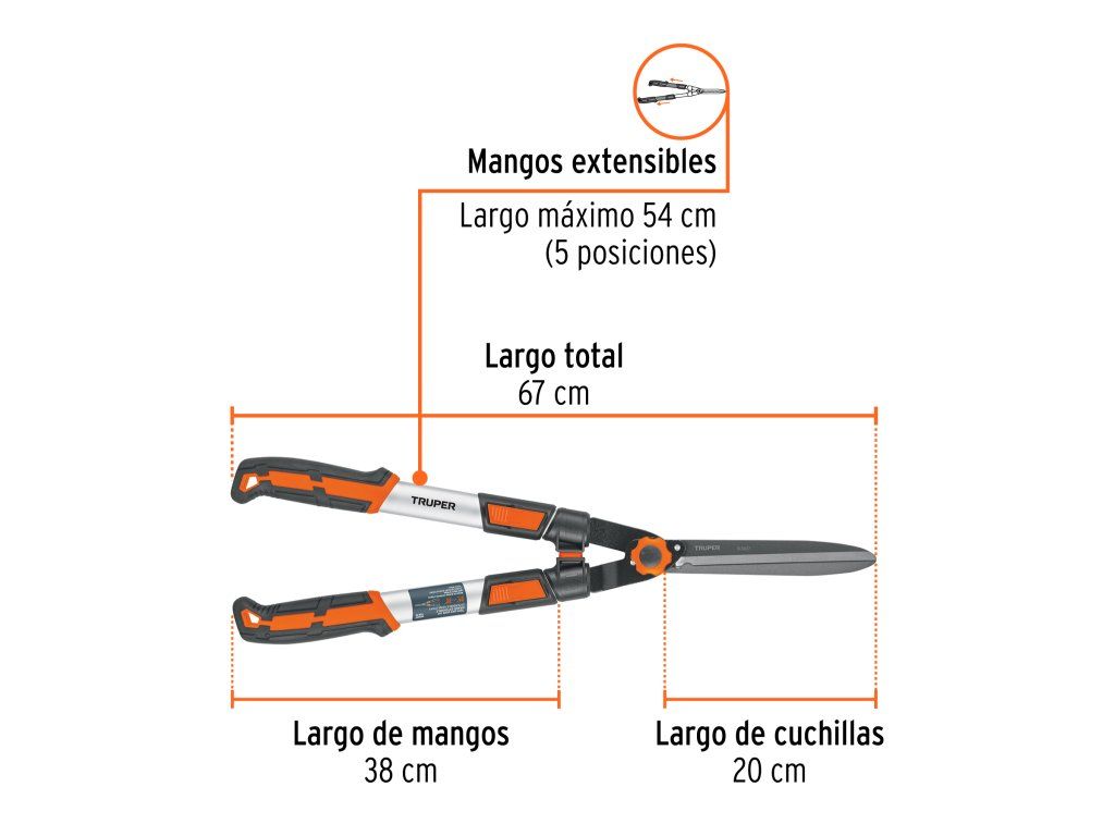 Nůžky na živý plot TRUPER TEX-19: nůžky s teleskopickými hliníkovými rukojeťmi (38–54 cm), čepele z manganové oceli a 5 poloh nastavení.