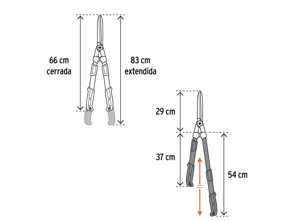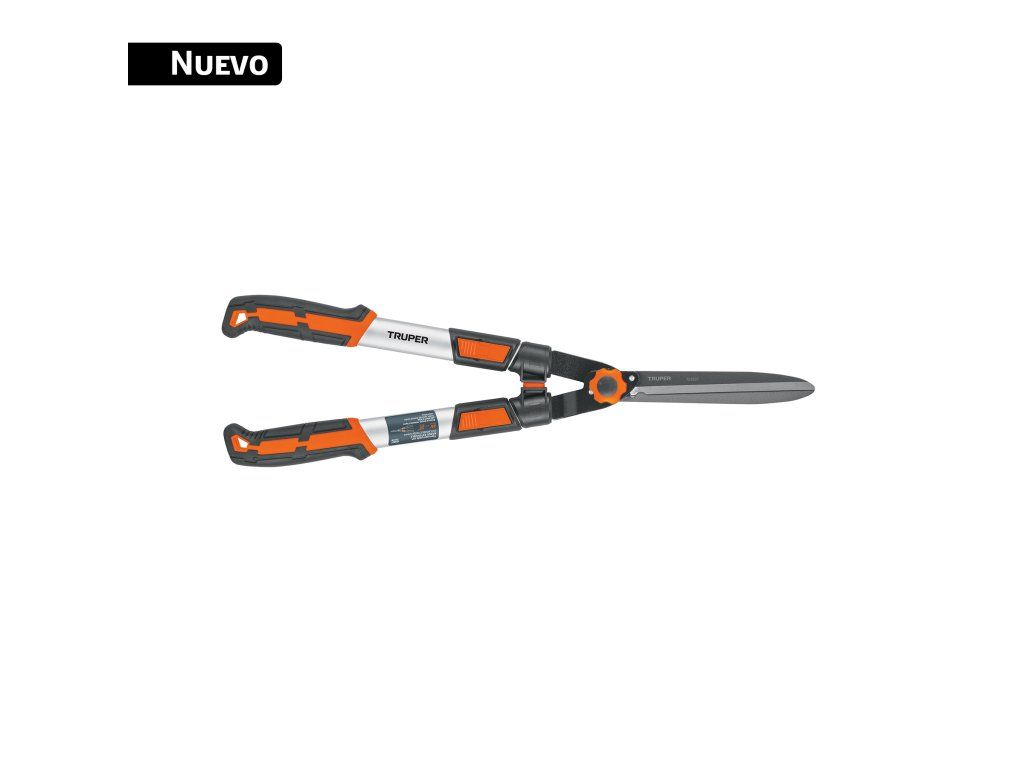 Nůžky na živý plot TRUPER TEX-19 jsou určeny pro stříhání a úpravu živých plotů a keřů. Čepele z manganové oceli zajišťují vysokou odolnost proti nárazu a dlouhou životnost. Hliníkové rukojeti jsou lehké a pevné, což snižuje únavu při práci. Protiskluzový grip z polypropylenu a TPE zlepšuje uchopení. Teleskopické rukojeti umožňují nastavení délky od 38 cm do 54 cm v 5 polohách.
